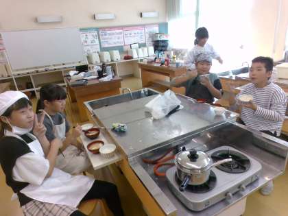 調理実習【5年生】 公開日 2023/10/19 更新日 2023/10/19 5年生 家庭科「食べて元気!ご飯とみそ汁」の学習で、調理実習を行いました。多くの子供たちがガスでお米を炊いたことがなく、お米に入れた水が沸騰していく様子や、時間をかけて炊きあがったお米にたくさんの歓声が上がりました。また、みそ汁作りでは、煮干しでだしを取ることから行いました。出来上がったご飯とみそ汁を食べるときには、自分で作り上げた料理の美味しさ感じながら食べました。