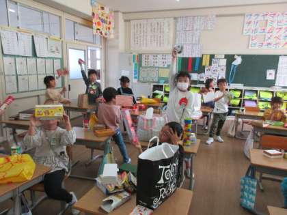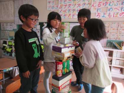 みんなが持ち寄った箱を使って、タワー作りに取り組みました。