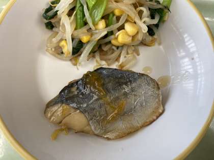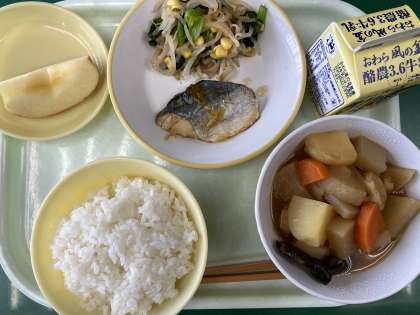 今日の献立は、ごはん、鯖の幽庵焼き、コーン和え、おでん、りんご、牛乳です。