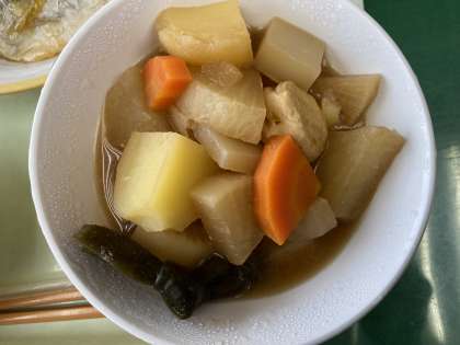 コーン和えは、もやしがしゃきしゃきしており、冷たくてさっぱりしていました。おでんは、大根やじゃがいも、がんもどきに出汁がしみこんでいます。ごはんが進みます。今日もおいしくいただきました!