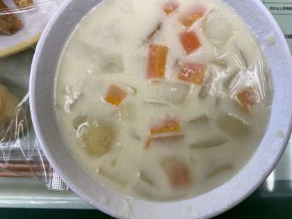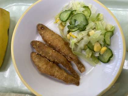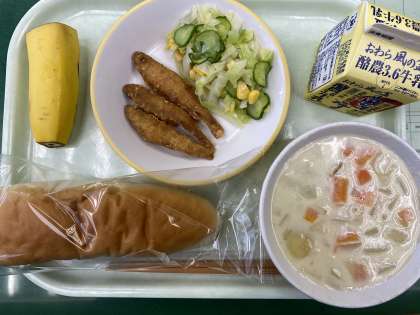 今日の献立は、米粉コッペパン、わかさぎのフリッター、コールスローサラダ、クラムチャウダー、バナナ、牛乳です。
