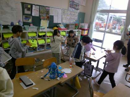 図工の後の様子です。みんなで協力して教室を綺麗にしています。