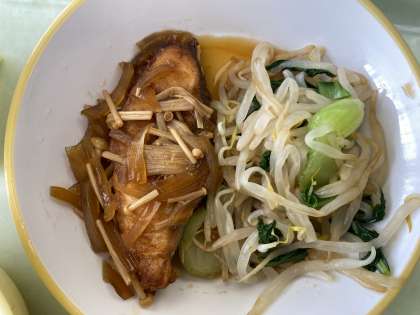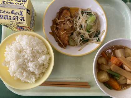 今日の献立は、ごはん、魚の黒酢あん、もやしのおひたし、関東だき、牛乳です。