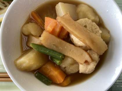 関東だきは、がんもどきやいんげん、さつまいも揚げ等が入っています。出汁がしみこんでいて柔らかく煮込まれていました。