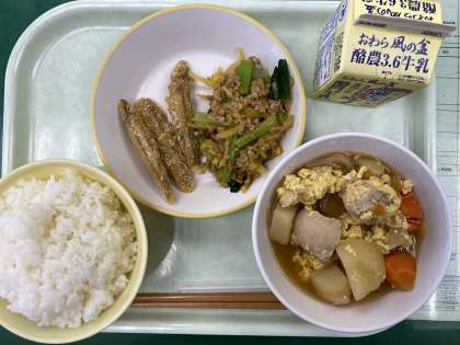 12月5日(火) 今日の給食 公開日 2023/12/05 更新日 2023/12/05 お知らせ・お願い 今日の献立は、ごはん、きびなごのから揚げ、納豆和え、親子煮、牛乳です。 納豆和えは、ひきわり納豆の粘りとしょうゆ・たくあんのしょっぱさが絶品です。ごはんに合いますね。 親子煮には、コロコロした鶏肉が入っていました。 今日もおいしくいただきました!