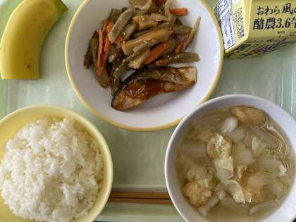 12月6日(水) 今日の給食 公開日 2023/12/06 更新日 2023/12/06 お知らせ・お願い 今日の献立は、ごはん、ふくらぎの照焼、茎わかめのきんぴら、具だくさん汁、バナナ、牛乳です。 具だくさん汁は、玉ねぎや大根、白菜など野菜がたっぷり入っていました。きんぴらに入っている茎わかめやごぼうは、かむほどに味が出ておいしいです。 今日もおいしくいただきました!