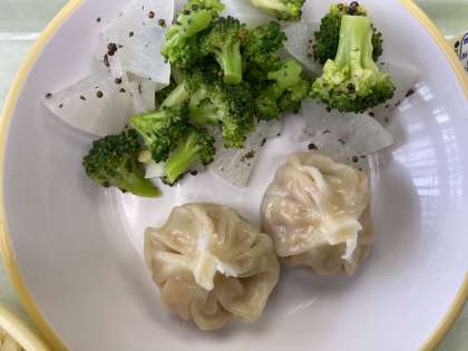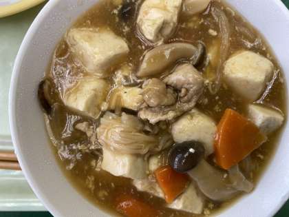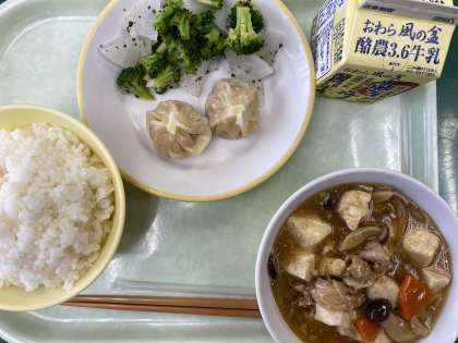今日の献立は、ごはん、ショウロンポウ、大根とブロッコリーのえごまサラダ、豆腐ときのこのあんかけ煮、牛乳です。