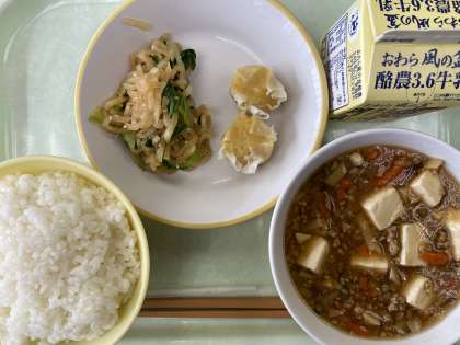 12月19日(火) 今日の給食 公開日 2023/12/19 更新日 2023/12/19 お知らせ・お願い 今日の献立は、ごはん、にんじんシューマイ、大根ナムル、マーボー豆腐、牛乳です。 今日のマーボーの豆腐は、やわらかい絹ごし豆腐です。辛すぎないピリッとした味付けでした。今日もおいしくいただきました!