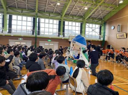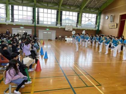 「マツケンサンバ」や「きときとの夢」など、小学生に馴染みの曲を演奏してくださいました。また、楽器の紹介やドリル演奏もしてくださいました。ジンぼっこはみんなノリノリになって体を動かしながら聞き入っていました。素敵なひとときでした。