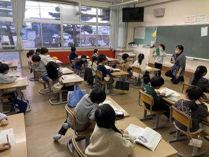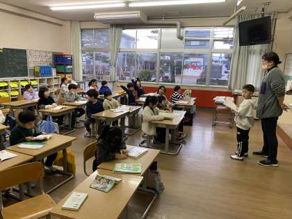 音読の練習をしていました。一人が前に立って音読し、みんながその人の読みに続いて読みます。上手に声を揃えて読むことができていました。