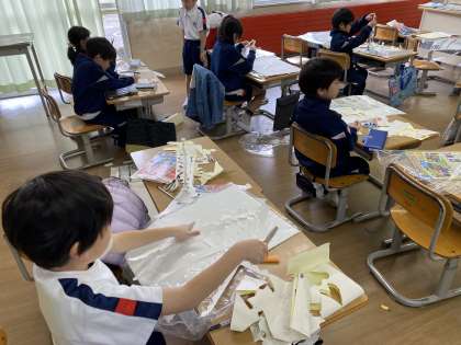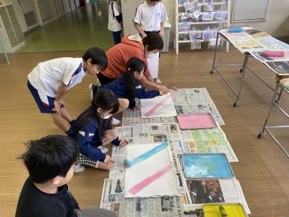 【1年生】ステンシルローラー版画 公開日 2024/01/31 更新日 2024/01/31 1年生 1年生は、版画に挑戦しています。ローラーを転がし、貼ってはがせるシールを貼る、はがすをくりかえし作ります。 思い描く世界が表現できたでしょうか。