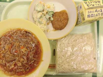 2月5日(月) 今日の給食 公開日 2024/02/05 更新日 2024/02/05 お知らせ・お願い 今日の献立は、ソフト麺の五目あん、鶏つくね、ポテトサラダ、牛乳です。 今日のソフト麺は、五目あんでした。しいたけやたけのこ、もやしなどがたっぷり入っていました。麺とからんで食べやすいです。鶏つくねは、めずらしいメニューです。一見ハンバーグのようですが、味はしっかり鶏つくねでした。