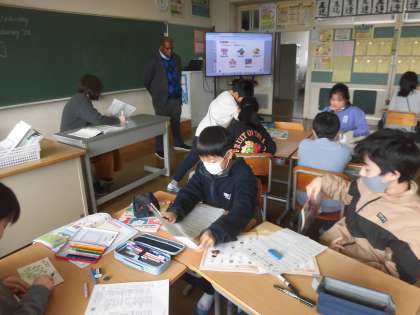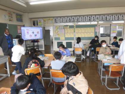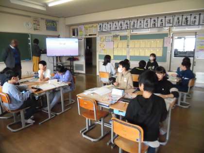 【5年生】外国語 日本らしいものを紹介しよう 公開日 2024/02/07 更新日 2024/02/07 5年生 ALTの先生と外国語科の授業です。 日本らしいものを英語で紹介する会話を考えていました。