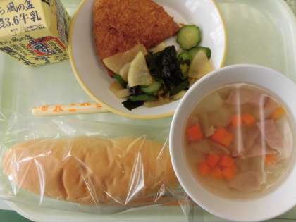 2月9日(金) 今日の給食 公開日 2024/02/09 更新日 2024/02/09 お知らせ・お願い 今日の献立は、コッペパン、アジフライ、大根サラダ、マカロニスープ、棒チーズ、牛乳です。 アジフライはさくさくで食べやすいです。マカロニスープは、小さなマカロニと小さなサイコロ状のニンジンが口当たりがよく美味しいです。ハートに型抜きされたニンジンもありました! 今日もおいしくいただきました!