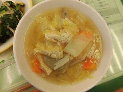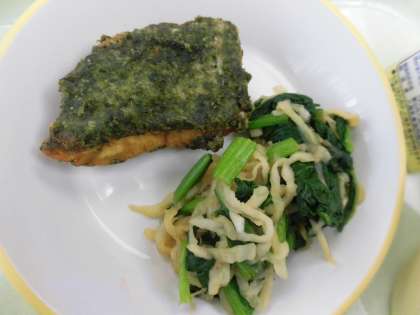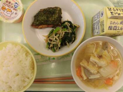 今日はセレクト献立です。ごはん、はりはり和え、具だくさん汁、牛乳です。セレクトおかずは、ハンバーグか魚の磯辺揚げです。セレクトデザートは、桃のタルトかみかんのババロアです。