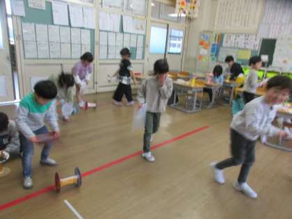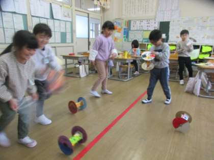 図工の時間に作成した紙皿ころころが完成したので、みんなで遊びました。