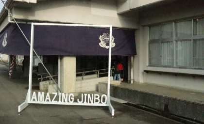 児童玄関は幕とAMAZING JINBOのモニュメントで飾られました。