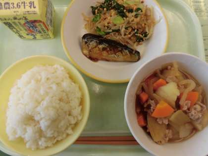 4月10日(水) 今日の給食 公開日 2024/04/10 更新日 2024/04/10 今日の給食 今日の献立は、ごはん、いわしの梅煮、いり大豆和え、肉じゃが、牛乳です。 今年度の給食が始まって3日目です。今年度も給食の献立を紹介します。久しぶりに食べる給食は、温かくおいしいです!肉じゃがは具材がやわらかく味がしみています。 今日もおいしくいただきました!