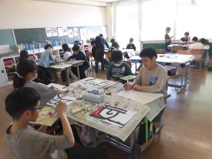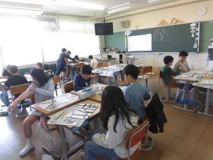 【6年生】図工 公開日 2024/04/16 更新日 2024/04/16 6年生 6年生は、図工でデザインの学習をしていました。 自分の名前を画用紙いっぱいにデザインして、水彩で色をつけていました。 どんな作品ができあがるか楽しみです!
