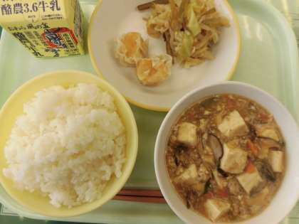 4月18日(木) 今日の給食 公開日 2024/04/18 更新日 2024/04/18 今日の給食 今日の献立は、ごはん、マーボー豆腐、にんじんシューマイ、茎わかめのチョナムル、牛乳です。「チョナムル」とは韓国の酢の物です。 「チョ」は酢、「ナムル」は和え物という意味だそうです。マーボー豆腐は、ひき肉と豆腐の組み合わせで、いつもながらのおいしさです。少しだけ辛みが効いています。 今日もおいしくいただきました!
