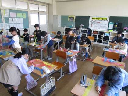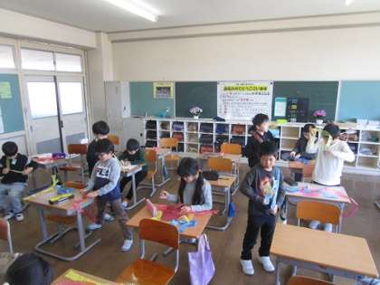 登校後、8時から朝活動に取り組んでいます。自分の仕事をはっきりさせるために、仕事内容を書いたたすきを掛けて、取り組んでいます。