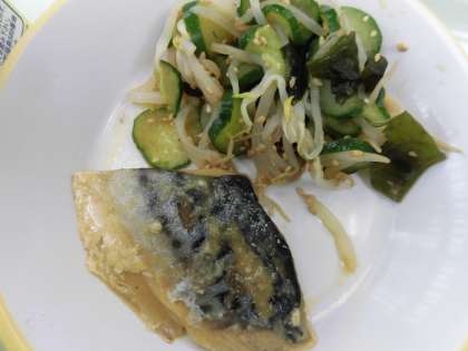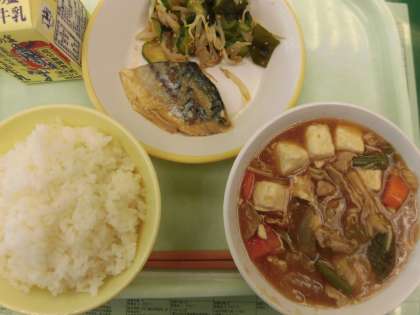 今日の献立は、ごはん、さばのみそ煮、ごま酢和え、豆腐と野菜のうま煮、牛乳です。