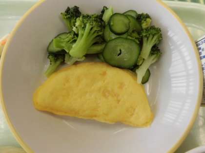 今日の献立は、減量パン、焼きそば、オムレツ、ドレッシングサラダ、棒チーズ、牛乳です。