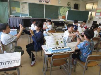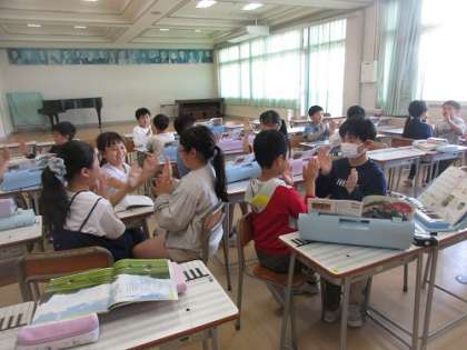 音楽科の学習で、「茶つみ」を歌いながら友達とリズム遊びをしました。友達と合わせる楽しさや難しさを楽しみました。