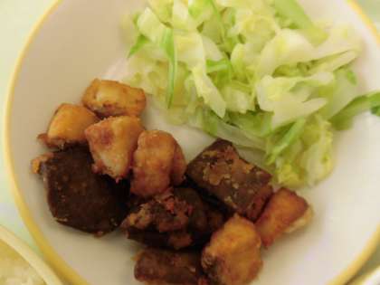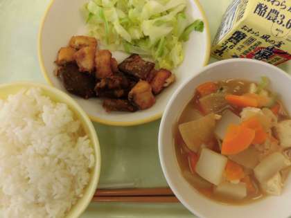 4月30日(火) 今日の給食 公開日 2024/04/30 更新日 2024/04/30 今日の給食 今日の献立は、ごはん、魚とレバーの揚げからめ、ゆでキャベツ、ごまけんちん、牛乳です。ごまけんちんは、ねりごまの風味がとてもよいです。大根やこんにゃくなどの具材がうすく切られており、味がしみこんでいます。 魚とレバーの揚げからめは、カリカリしています。今日もおいしくいただきました!