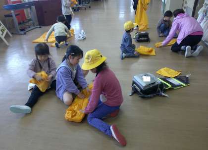 雨が降った日、カッパを着て登校する1年生。カッパをたたむのが、じょうずになってきました。