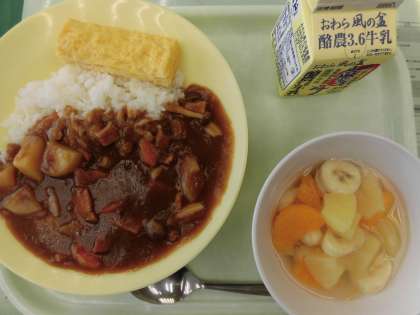 5月22日(水) 今日の給食 公開日 2024/05/22 更新日 2024/05/22 今日の給食 今日の献立は、ハヤシライス(ごはん)、卵ロール、フルーツミックス、牛乳です。 ハヤシライスは、子供たちに大人気メニューの一つです。じゃがいもやニンジン、玉ねぎ、ベーコンなどの具もたくさん入っています。フルーツミックスも甘くておいしいです。 今日もおいしくいただきました!