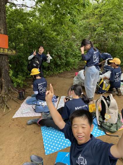 来拝山の頂上です。雨もあがり、子供たちは元気な様子です。 お弁当をおいしくいただきました。