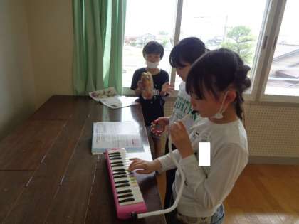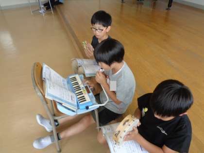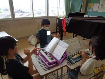 鍵盤ハーモニカと打楽器で楽しいマーチのリズムアンサンブルに挑戦しました。ノリノリな子供たちです。