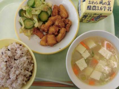 6月3日(月) 今日の給食 公開日 2024/06/03 更新日 2024/06/03 今日の給食 今日の献立は、雑穀入りごはん、いかのかりん揚げ、華風和え、すいとん、牛乳です。 今日は、「かみかみ献立」の日です。雑穀入りのごはんは普通の白米よりかみ応えがあります。また、いかのかりん揚げもかむほどに味が出ておいしいです。 ごちそうさまでした!