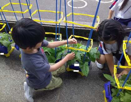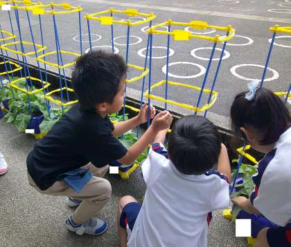アサガオのつるが伸びてきました。子供たちに、つるの写真を見せてどうするか考えさせると「2年生さんがやっているみたいに棒(支柱)を立てればいい」ということになりました。支柱を立てた後のアサガオの成長が楽しみです。