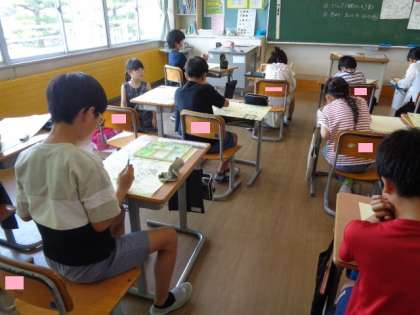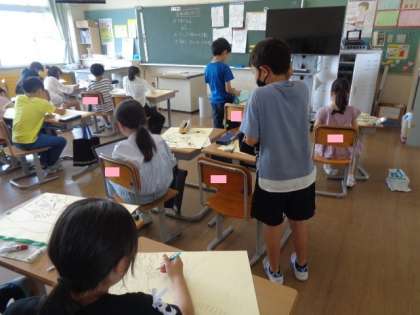 かもとりごんべえとジャックと豆の木の絵から好きな場面を選び、絵をかいています。出来上がりが楽しみです。
