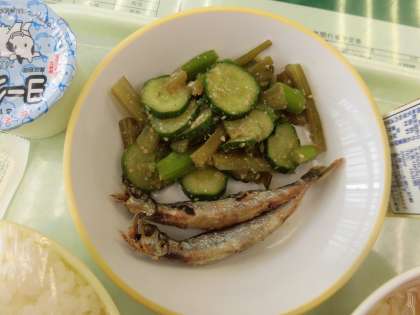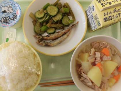 今日の献立は、ごはん、ししゃもの米粉あげ、茎わかめの中華和え、塩肉じゃが、ヨーグルト、牛乳です。