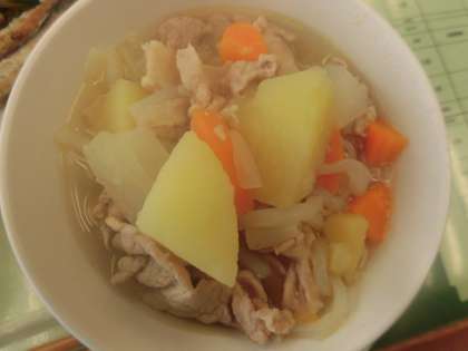 今日の肉じゃがは、塩ベースの出汁です。豚肉やじゃがいもの味がしみています。ししゃもはカリッとしています。今日もおいしくいただきました!