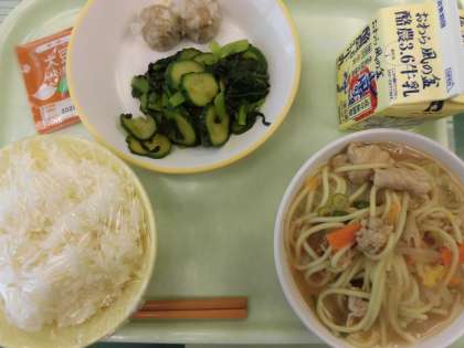 6月18日(火) 今日の給食 公開日 2024/06/19 更新日 2024/06/19 今日の給食 今日の献立は、ごはん、肉シュウマイ、しょうがひたし、とんこつラーメン、大豆ふりかけ、牛乳です。 とんこつラーメンは、めんもスープもとてもおいしいです!