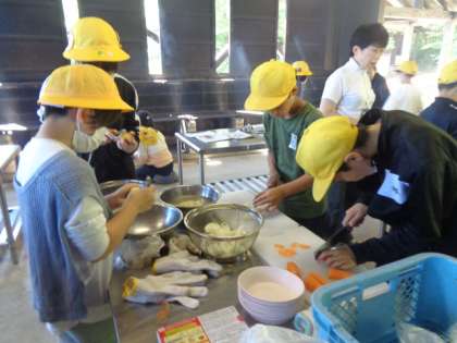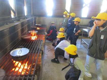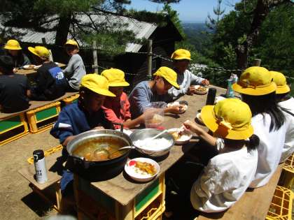 2日目の活動は野外炊飯。ご飯とカレーを作りました。班ごとに手際よく調理することができ、予定より大幅に早く完成しました。11時には、山の景色を見ながらおいしいカレーを食べることができました。来たときよりも美しくを目指し、片付けも進んで行いました。