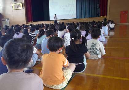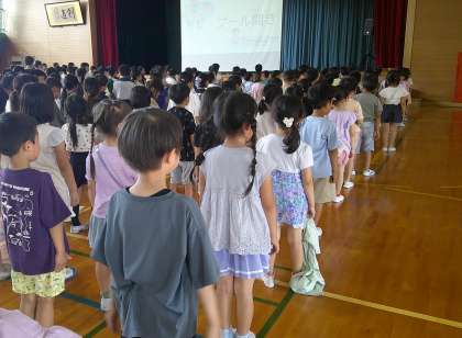 プール開きがありました。運動委員会児童が「かぶとむし」に扮し、プールを使うときの約束を分かりやすく演じたり、クイズを出したりしました。「かけない」「ふざけない」「とびこまない」「むりをしない」「しずかにきく」を守って、安全に活動したいと思います。また、養護教諭からは「あじさい」の話を聞きました。「朝ごはんを食べる」「準備をする(爪、医者、タオル)」「さあ、寝よう(睡眠)」「いつものカード(プールカードをしっかり記入)」の4つです。これらに気を付けて、元気に水泳学習をしたいと思います。