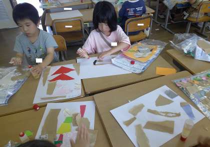 1年生 やぶいたかたちからうまれたよ 公開日 2024/06/27 更新日 2024/06/27 1年生 図画工作科で、いろいろな紙を破り、その形を見ていろいろな方向から見たり並べたりしながら作品づくりを行いました。
