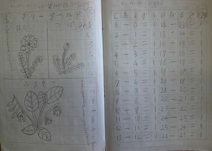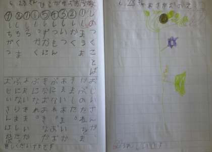 月曜日に自学ノートを集めました。今まで勉強した計算や文字の練習をしている子が多かったのですが、アサガオの色水づくりの説明や身近な植物を観察したことを書いている子もいました。いろいろな取り組みを通して、学力を伸ばしたり、好きなことへの興味を深めたりできたらいいですね。