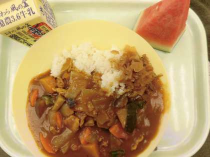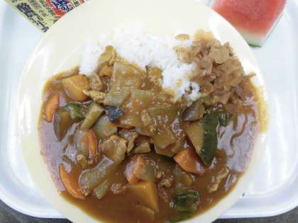 なすやかぼちゃ、ピーマンなどの夏野菜がたくさん入っています。デザートにすいかもついており、夏気分たっぷりの給食です!今日もおいしくいただきました!