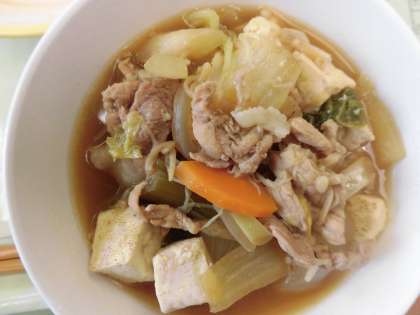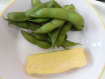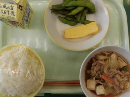 今日の献立は、ごはん、厚焼き卵、枝豆、韓国風すきやき、牛乳です。