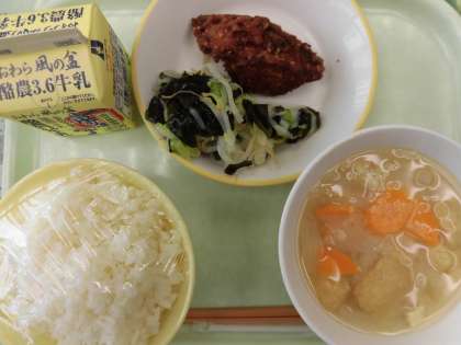 今日の献立は、ごはん、魚の利久揚げ、酢の物、みそ汁、牛乳です。