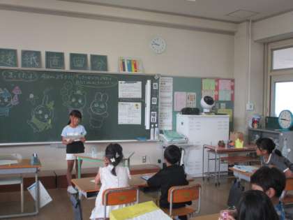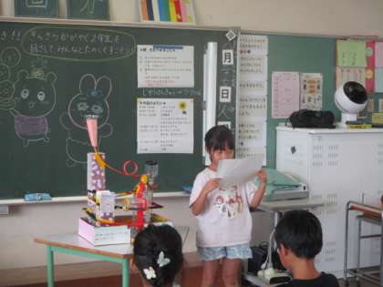 今日から2学期のスタートです。夏休みに頑張って作った自由研究や自由工作の見てほしいところをみんなに伝えました。自分の頑張りがよく伝わる発表になりました。話を聞くときは、友達と目線をつないで静かに聞き、真剣な表情でした。2学期の授業も頑張りましょう!