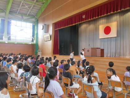 2学期始業式 公開日 2024/08/28 更新日 2024/08/28 学校行事 夏休みを終え、今日から2学期がスタートしました。 始業式では校長先生から「2学期は毎日を大切にして、たくさんのことにチャレンジしてほしい」とお話がありました。 校長先生のお話の後に、新しく赴任されたジャマイカ出身のALTの先生と転入児童の自己紹介がありました。 話す人の方を見て静かに話を聞いている子供たちの姿から、2学期への意欲が感じられました。