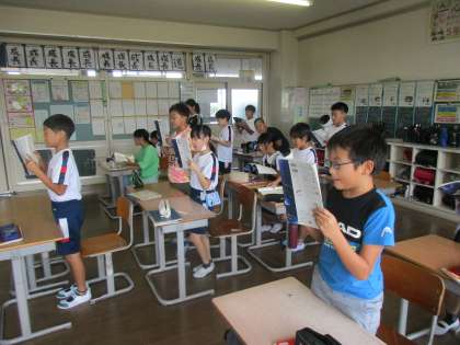 5年生 国語 詩の音読 公開日 2024/08/28 更新日 2024/08/28 5年生 2学期の学習が始まりました。 国語科「詩に親しもう」の学習で、詩「かぼちゃのつるが」「われは草なり」を音読しました。