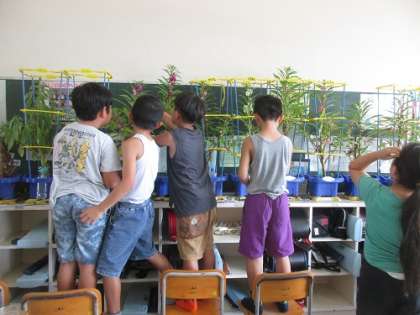 3年生 理科の観察 公開日 2024/08/28 更新日 2024/08/28 3年生 夏休み中、前庭の溝の中で過ごしたホウセンカの鉢を、教室の中に入れて、成長の様子を観察しました。「実」ができているものが多く、興味津々で観察しました。